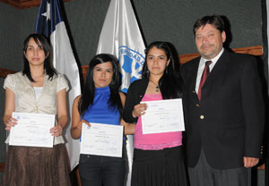 Ana Belén Fallard, Constanza Troppa, Romina Quintana junto al Vicedecano Gustavo Aravena en la ceremonia de premiación. |